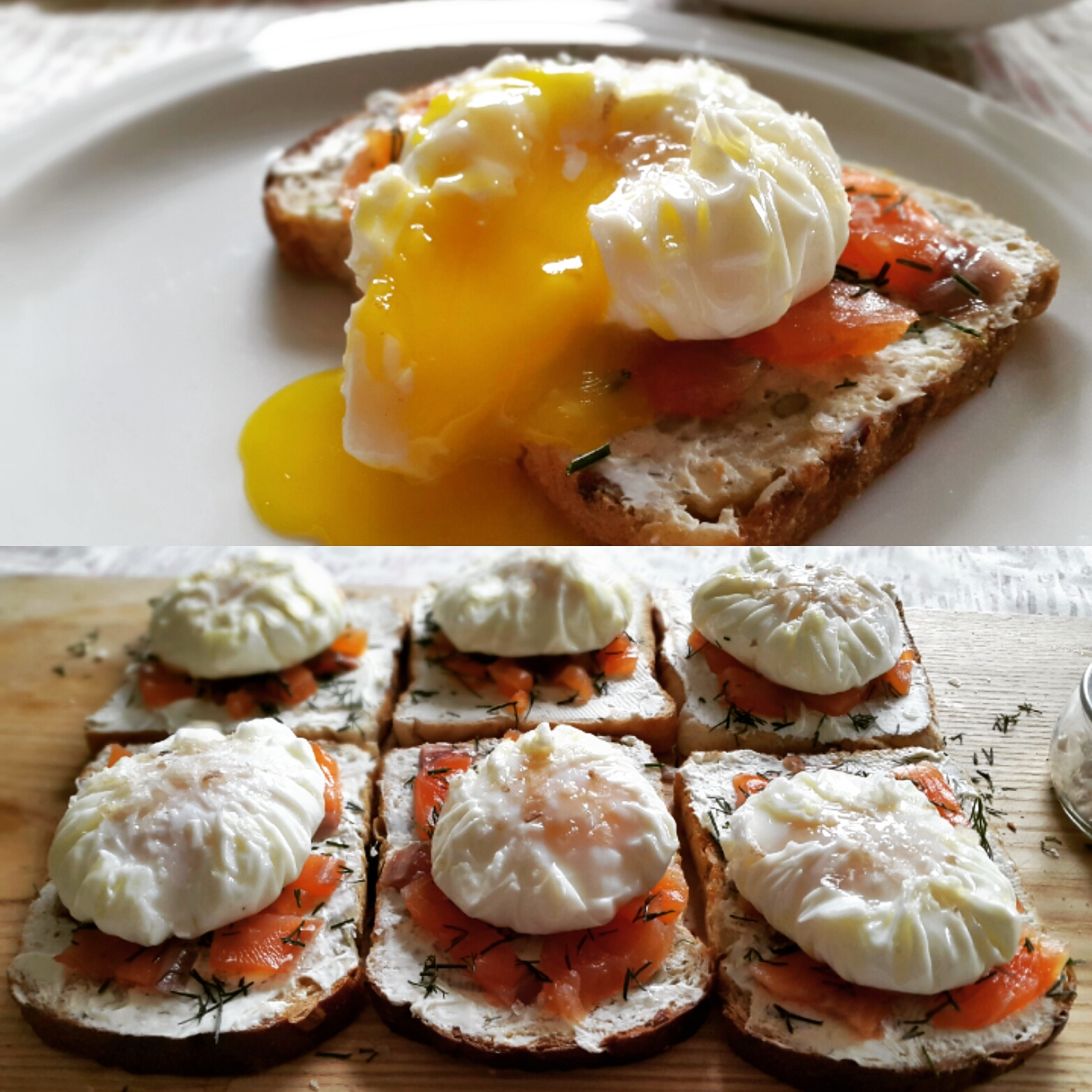 Patiekiau taip, kaip tada ragavau – ant skrebučio patepiau varškės kremo sūrio su žolelėmis (Vilkyškių su katinu), pasmulkinau sūdytos lašišos, pabarsčiau krapų ir ant viršaus – kiaušinis:)